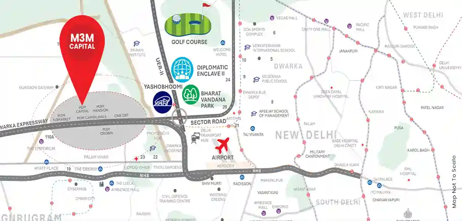 M3M Capital, located in Sector 113 along Dwarka Expressway, Gurugram, is an iconic M3M residential development offering luxurious 2.5 BHK, 3.5 BHK, 4 BHK and 4.5 BHK apartments in a gated community. Spread over approximately 30 acres, the project comprises 11 towers (some sources mention 5 towers) rising up to 36 floors, and delivers around 1,400 units. Every residence is designed for efficiency and comfort, with generous balconies, plenty of natural light, and views of landscaped central greens and a 9‑hole golf putting area. Key amenities include a 75,000 sq ft clubhouse, spa, indoor temperature‑controlled swim pool, squash court, aqua gym, water‑park, open‑air theatre, jogging track, kids play zone, and more. Strategically located right on the Dwarka Expressway, M3M Capital offers seamless connectivity to IGI Airport (approx. 7 min), the Yashobhoomi convention centre, the Delhi–Gurgaon metro corridor, and upcoming urban hubs.